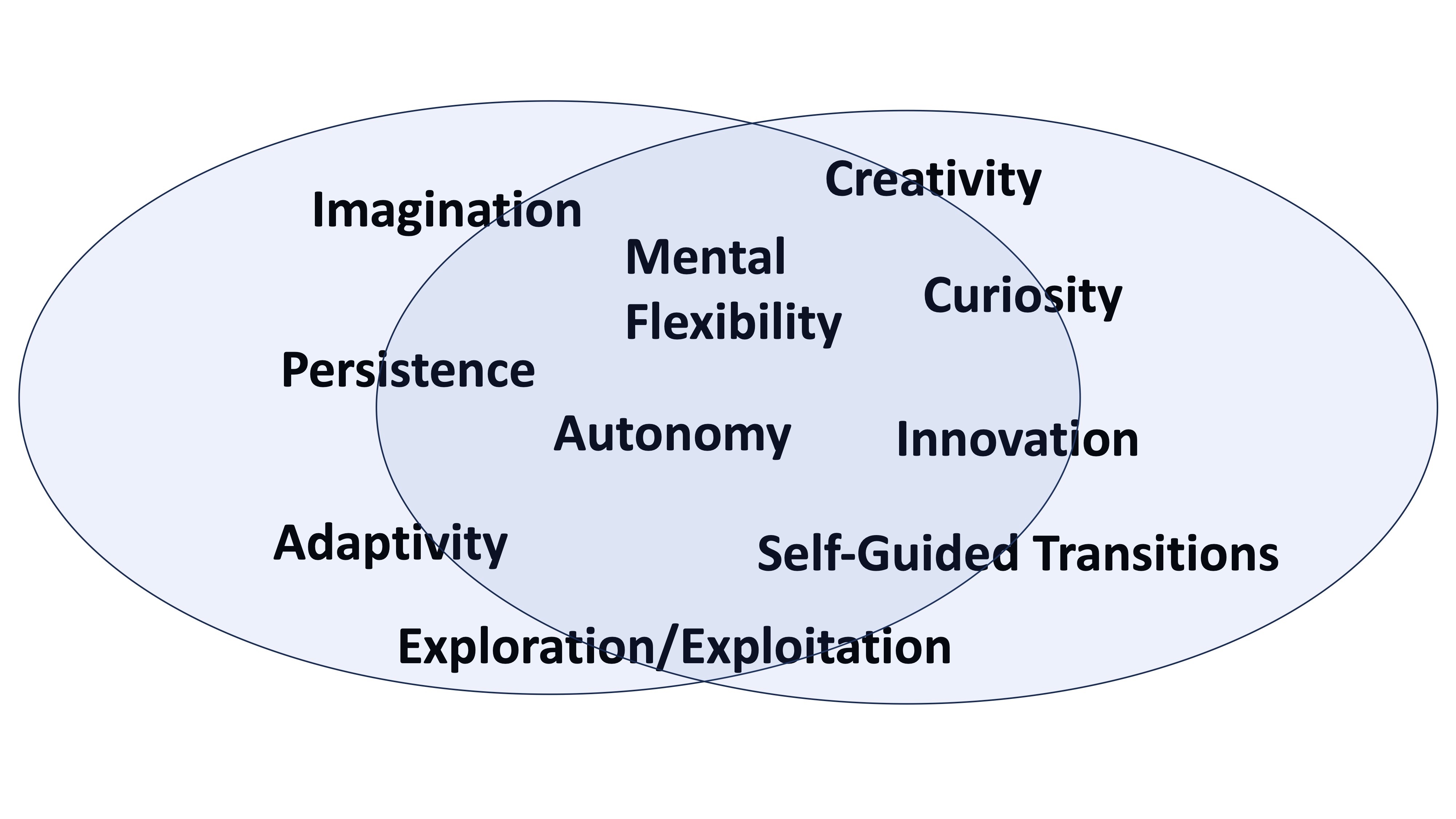 - dynamic processes of creative ideation and problem-solving assessed by Self-Guided Transitions or SGTs, see Koutstaal_2025_self-guided-transitions_and_creative_idea_search