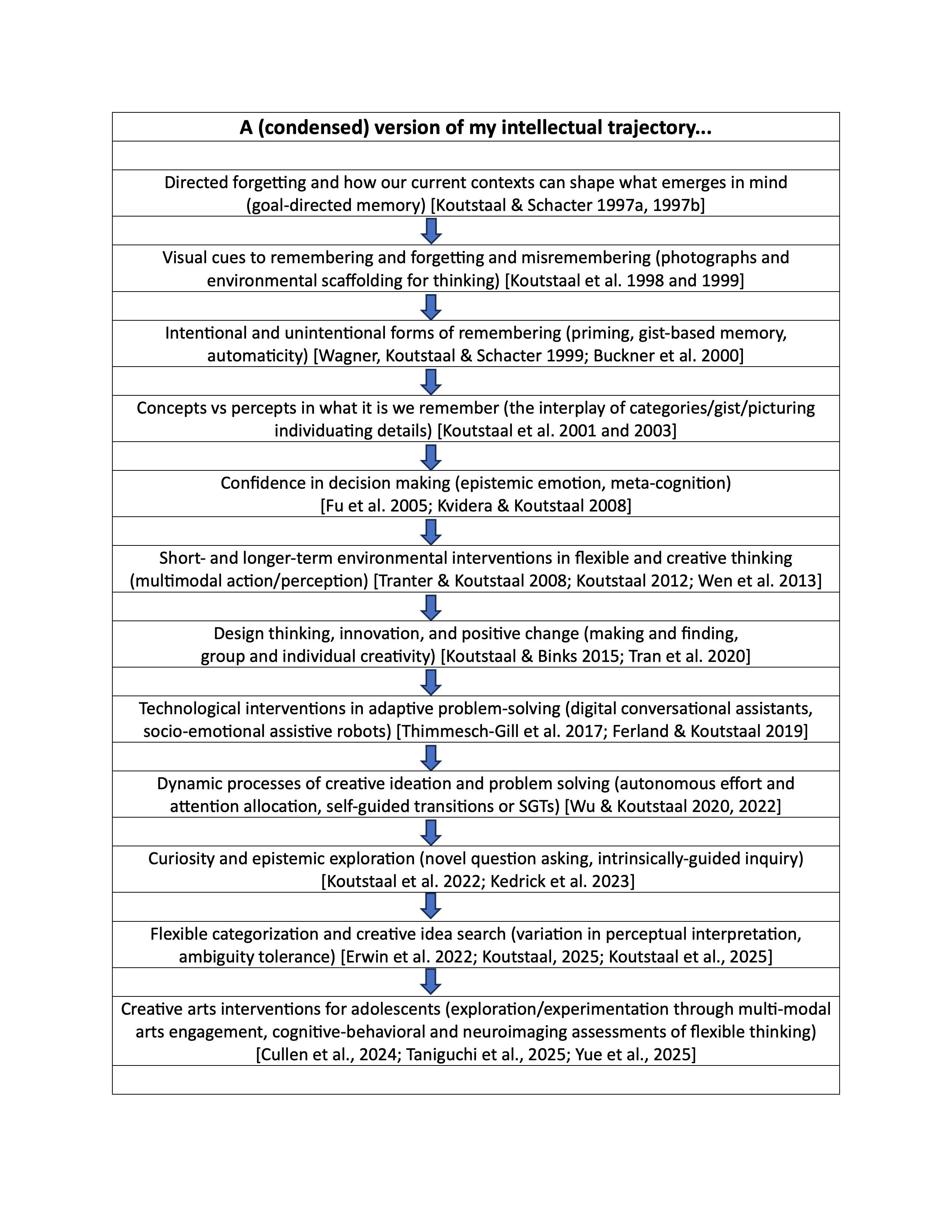 - creative arts interventions for adolescents and assessment of cognitive, neural, and behavioral changes (collaboration with Dr. Kathryn Cullen, Dept. of Psychiatry), see Yue__Koutstaal_creative_imagination_task_adolescents_2025